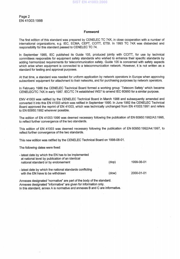 EN 41003:1998 is a standard published by CLC. Its full title is "Particular safety requirements for equipment to be connected to telecommunication networks". This standard covers: This standard applies to equipment designed and intended to be connected to a TELECOMMUNICATIONS NETWORK termination. It does not apply to equipment coverd by EN 60950. It applies regardless of ownership or responsibility for installation or maintenance of the equipment, and regardless of the source of power. The requirements for the following items are not covered by this standard: functionnal reliability of equipment, telecommunication facilities with remote supply using HAZARDOUS VOLTAGE, protection of equipment or TELECOMMUNICATION NETWORKS from damage.
