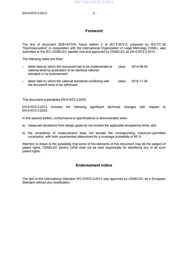 b) the uncertainty of measurement does not exceed the corresponding maximum-permitted uncertainty, with both uncertainties determined for a coverage probability of 95 %. Attention is drawn to the possibility that some of the elements of this document may be the subject of patent rights. CENELEC [and/or CEN] shall not be held responsible for identifying any or all such patent rights. Endorsement notice The text of the International Standard IEC 61672-3:2013 was approved by CENELEC as a European Standard without any modification. SIST EN 61672-3:2014