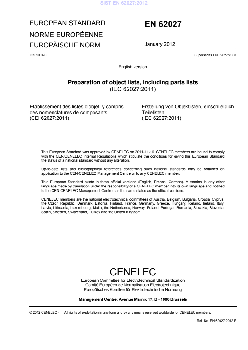 Keywords: EN 62027, IEC 62027:2011, object lists, parts lists, parts list standard, technical documentation, characteristic properties, parts list layout, CLC.