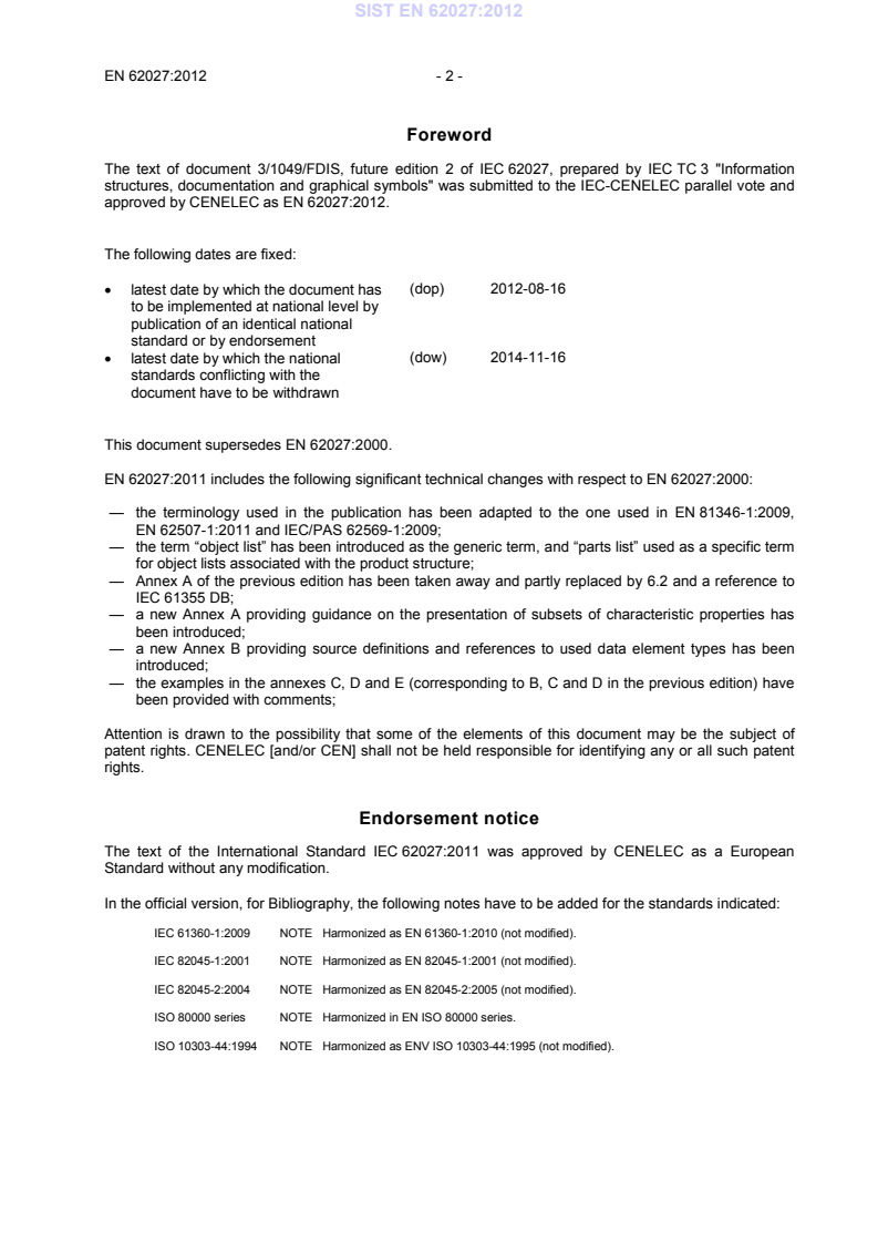 EN 62027:2012 is a standard published by CLC. Its full title is "Preparation of object lists, including parts lists". This standard covers: IEC 62027:2011 provides rules and guidelines for the presentation of information in object lists, and specific rules for such documents. It is applicable to object lists such as parts lists, function lists and location lists used in the design and engineering process intended to be supplied with the documentation. This edition includes the following substantial changes with respect to the previous edition: - the terminology used in the publication has been adapted to the one used in IEC 81346-1:2009, IEC 62507-1:2010 and IEC/PAS 62569-1:2009; - the term 'object list' has been introduced as the generic term, and 'parts list' used as a specific term for object lists associated with the product structure; - Annex A of the previous edition has been taken away and partly replaced by 6.2 and a reference to IEC 61355 DB; - a new Annex A providing guidance on the presentation of subsets of characteristic properties has been introduced; - a new Annex B providing source definitions and references to used data element types has been introduced; - the examples in the annexes C, D and E (corresponding to B, C and D in the previous edition) have been provided with comments.