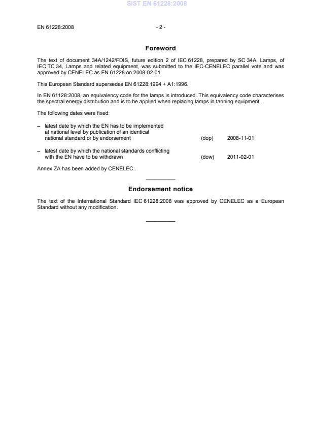 EN 61228:2008 is a standard published by CLC. Its full title is "Fluorescent ultraviolet lamps used for tanning - Measurement and specification method". This standard covers: This International Standard describes the method of measuring, evaluating and specifying the characteristics of fluorescent ultraviolet lamps that are used in appliances for tanning purposes. It includes specific requirements regarding the marking of such lamps. This second edition cancels and replaces the first edition published in 1993 and its Amendment 1 (1996). In this second edition, an equivalency code for the lamps is introduced. This equivalency code characterises the spectral energy distribution and is to be applied when replacing lamps in tanning equipment.