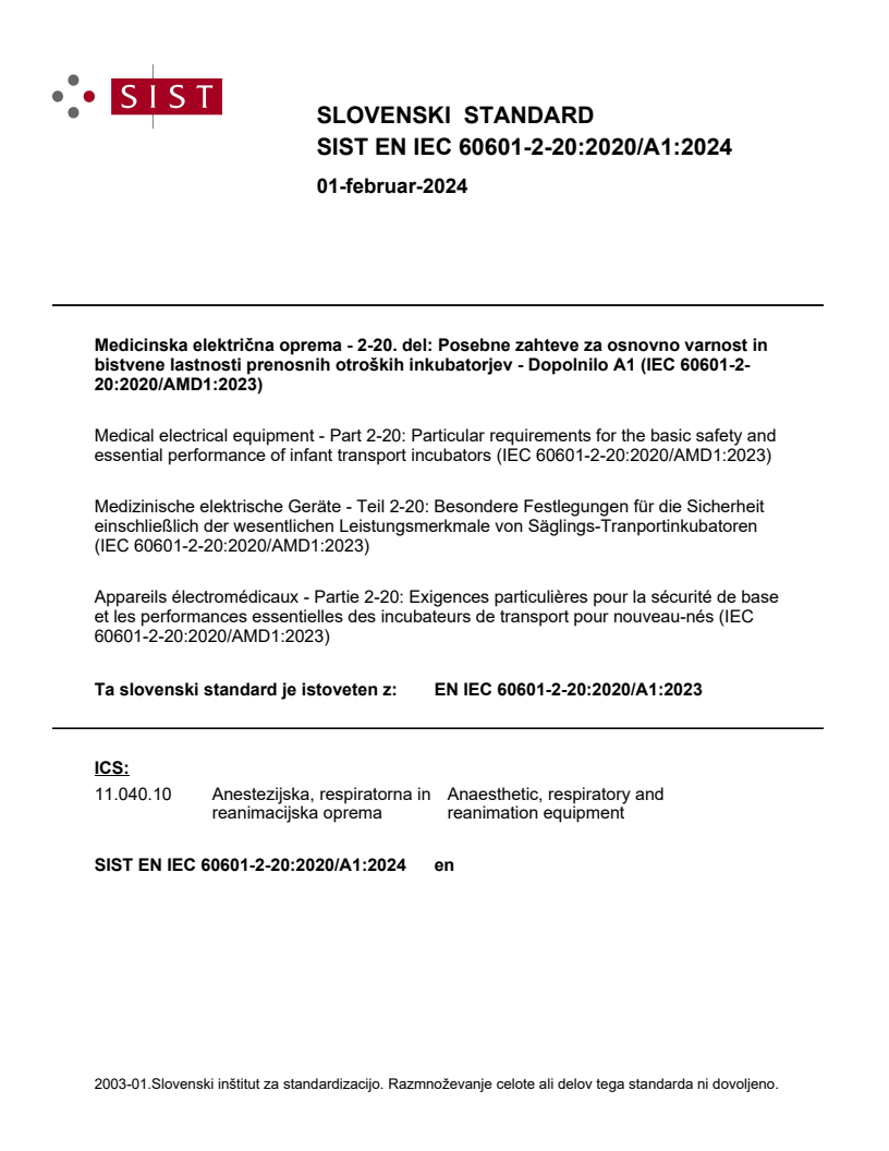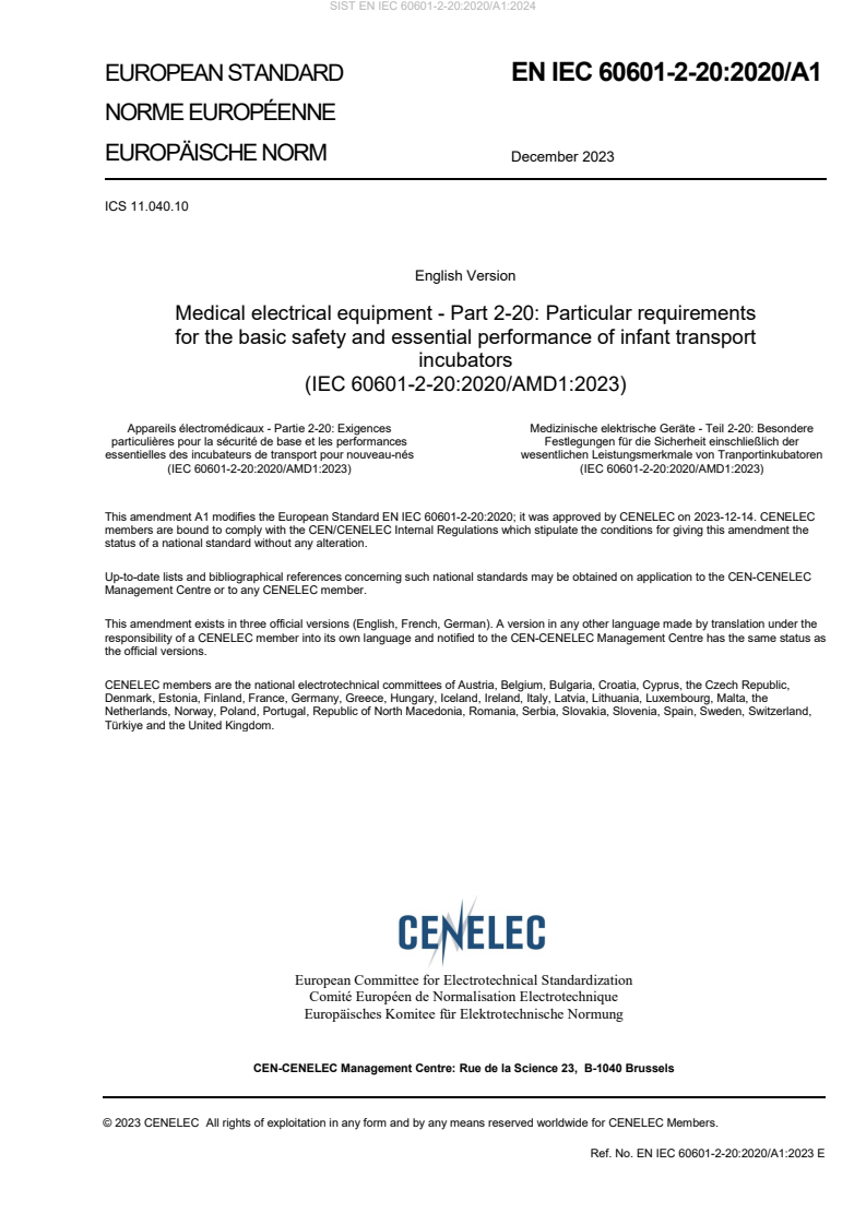 EN IEC 60601-2-20:2020/A1:2023 is the European adoption of Amendment 1 to IEC 60601-2-20:2020. It specifies particular requirements for the basic safety and essential performance of infant transport incubators (medical electrical equipment used to provide thermal and environmental support for neonates during transport). The amendment updates normative references, clarifies terms, and adds specific technical requirements (for example on alarms and temperature measurement applicability). This edition was approved by CENELEC (14 Dec 2023) and is intended for national implementation across member countries.
