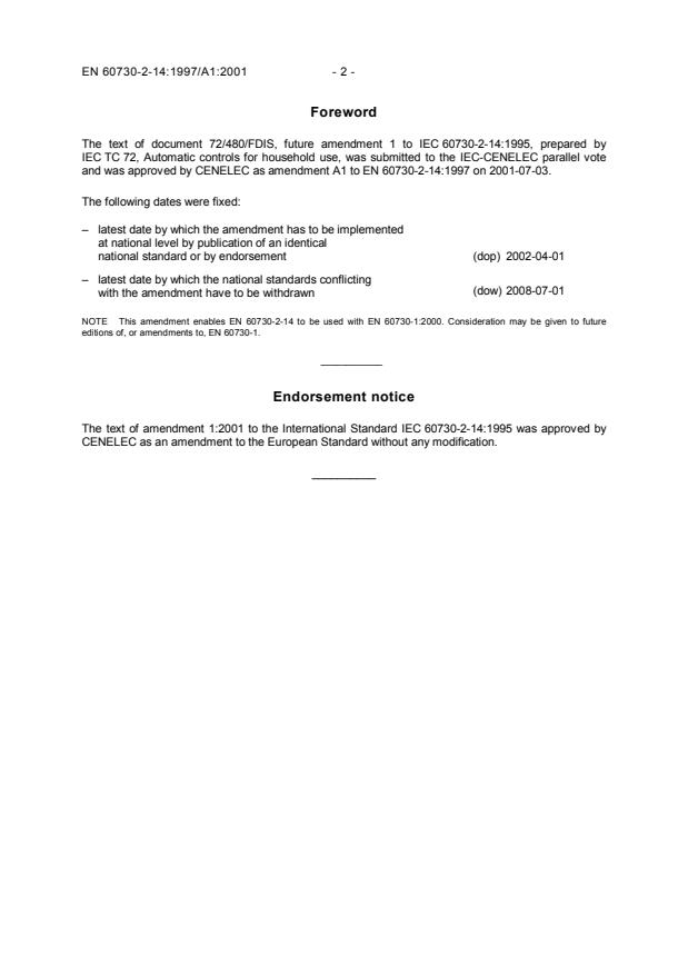 NOTE This amendment enables EN 60730-2-14 to be used with EN 60730-1:2000. Consideration may be given to future