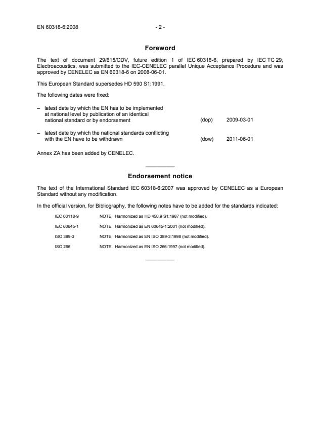 EN 60318-6:2008 has the following relationships with other standards: It is inter standard links to HD 590 S1:1991. Understanding these relationships helps ensure you are using the most current and applicable version of the standard.