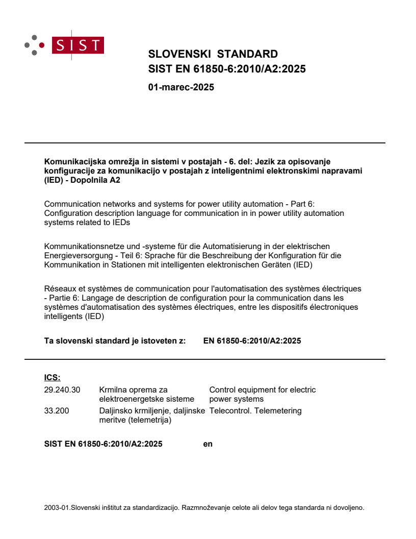 Ta slovenski standard je istoveten z: EN 61850-6:2010/A2:2025
