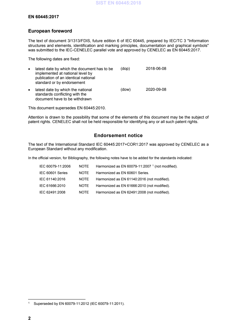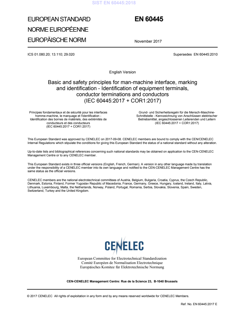 EN 60445:2017 is a standard published by CLC. Its full title is "Basic and safety principles for man-machine interface, marking and identification - Identification of equipment terminals, conductor terminations and conductors". This standard covers: NEW!IEC 60445:2017 is available as IEC 60445:2017 RLV which contains the International Standard and its Redline version, showing all changes of the technical content compared to the previous edition.IEC 60445:2017 applies to the identification and marking of terminals of electrical equipment such as resistors, fuses, relays, contactors, transformers, rotating machines and, wherever applicable, to combinations of such equipment (e.g. assemblies), and also applies to the identification of terminations of certain designated conductors. It also provides general rules for the use of certain colours or alphanumeric notations to identify conductors with the aim of avoiding ambiguity and ensuring safe operation. These conductor colours or alphanumeric notations are intended to be applied in cables or cores, busbars, electrical equipment and installations. This basic safety publication is primarily intended for use by technical committees in the preparation of standards in accordance with the principles laid down in IEC Guide 104 and ISO/IEC Guide 51. It has the status of a basic safety publication in accordance with IEC Guide 104.This sixth edition cancels and replaces the fifth edition of IEC 60445, published in 2010. This edition includes the following significant technical changes with respect to the previous edition: a) the text of the introduction has been moved into the scope in accordance with IEC Guide 104; b) colour codes for the identification of line conductors of DC systems; c) colour code for the identification of functional earthing conductor; d) update of Table A.1with colour codes for DC line conductors; e) conversion of notes containing non-mandatory requirements to normative text; f) the terminology is aligned with IEC 60050-195.