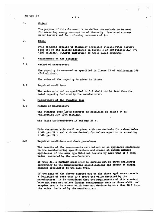 HD 500 S1:1988 is a standardization document published by CLC. Its full title is "Methods to be used for measuring energy consumption of thermal storage water heaters and for the purpose of informing consumers of it". This standard covers: States and defines the principal performance characteristics of electric storage water-heaters which are of interest to the user and to describe the standard methods for measuring these characteristics. This standard is concerned neither with safety nor with performance requirements.