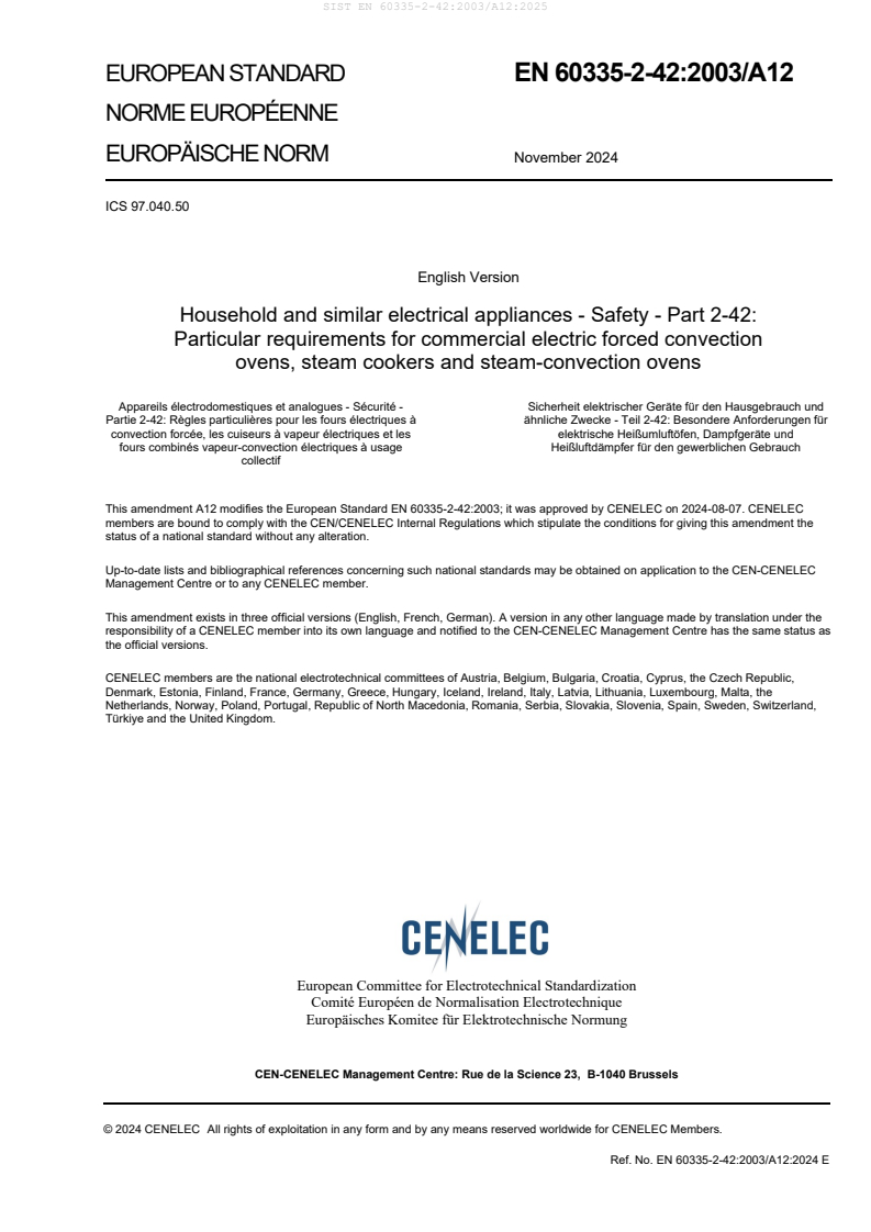 EN 60335-2-42:2003/A12:2024 is a amendment published by CLC. Its full title is "Household and similar electrical appliances - Safety - Part 2-42: Particular requirements for commercial electric forced convection ovens, steam cookers and steam-convection ovens". This standard covers: This European Standard deals with the safety of electrically operated commercial forced convection ovens, steam cookers, steam-convection ovens and, exclusive of any other use, steam generators, not intended for household use. The rated voltage being not more than 250 V for single-phase appliances connected between one phase and neutral and 480 V for other appliances. Appliances within the scope of this standard are typically used in restaurants, canteens, hospitals and commercial enterprises such as bakeries, butcheries, etc
