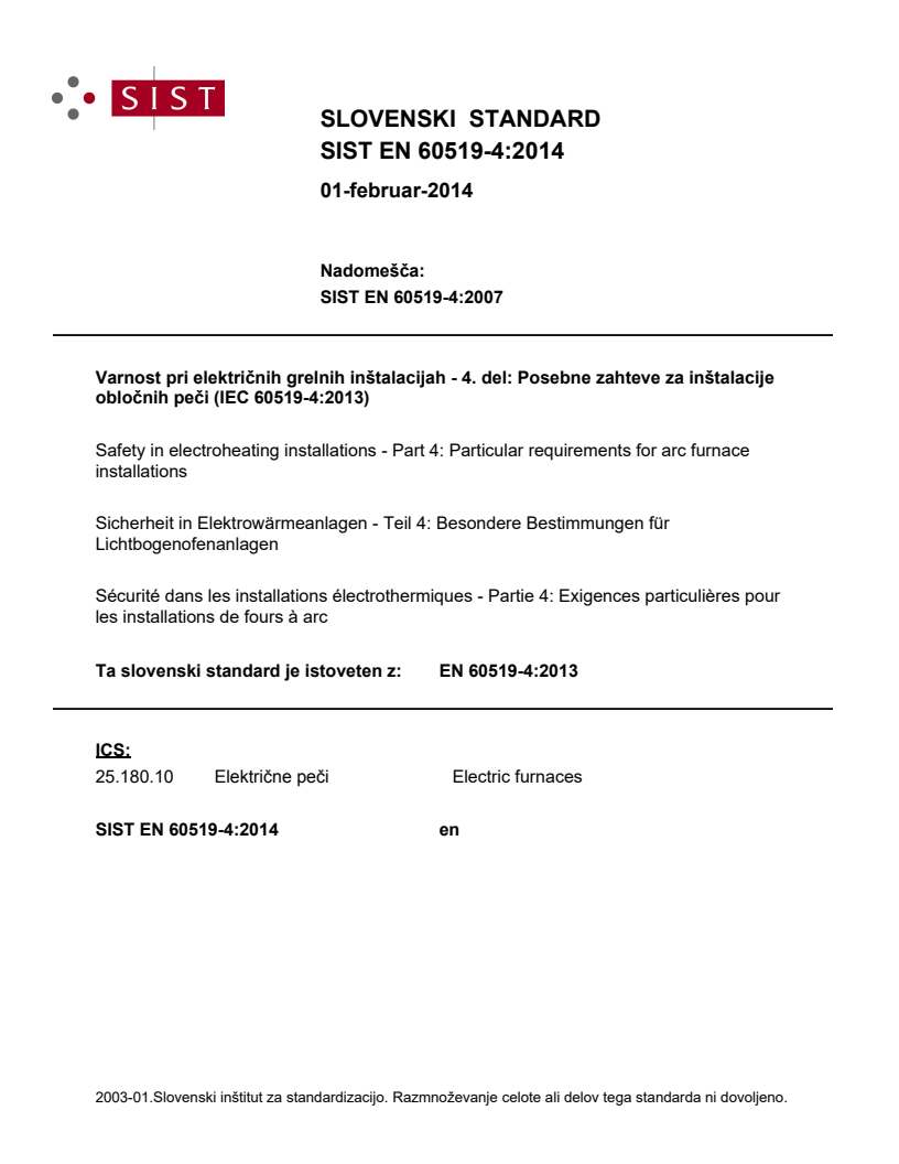Varnost pri električnih grelnih inštalacijah - 4. del: Posebne zahteve za inštalacije obločnih peči (IEC 60519-4:2013)