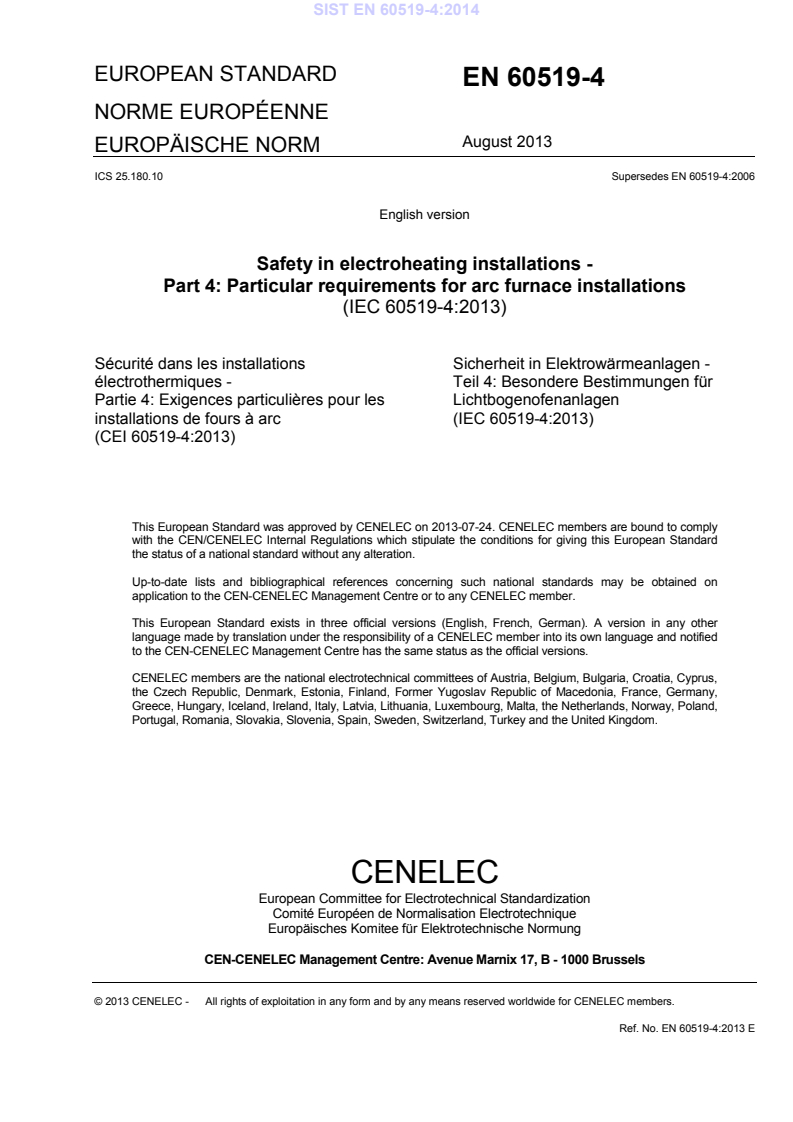 EN 60519-4:2013 is a standard published by CLC. Its full title is "Safety in electroheating installations - Part 4: Particular requirements for arc furnace installations". This standard covers: IEC 60519-4:2013 provides particular safety requirements for electric arc furnace installations and its operating and maintenance personnel. These safety provisions concern the protection of persons and the environment against dangers of electrical origin and also against certain dangers of non-electrical origin. This fourth edition cancels and replaces the third edition published in 2006. This edition constitutes a technical revision. This edition includes the following significant technical changes with respect to the previous edition: - The structure has been amended and adjusted to IEC 60519-1:2010; - The classification (Clause 4) has been adapted to details with respect to secondary voltage in electric arc furnace installations; - All provisions have been redrafted and the text is more concise with respect to EAF; - Annexes AA, BB and CC have been restructured, with respect to details concerning high voltage designs and non-electrical issues, however to be aware of in those installations.