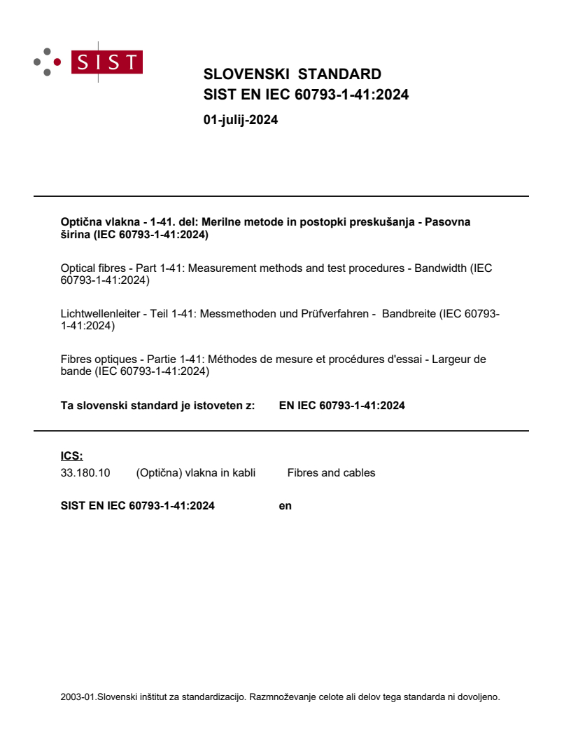 Optična vlakna - 1-41. del: Merilne metode in postopki preskušanja - Pasovna širina (IEC 60793-1-41:2024)