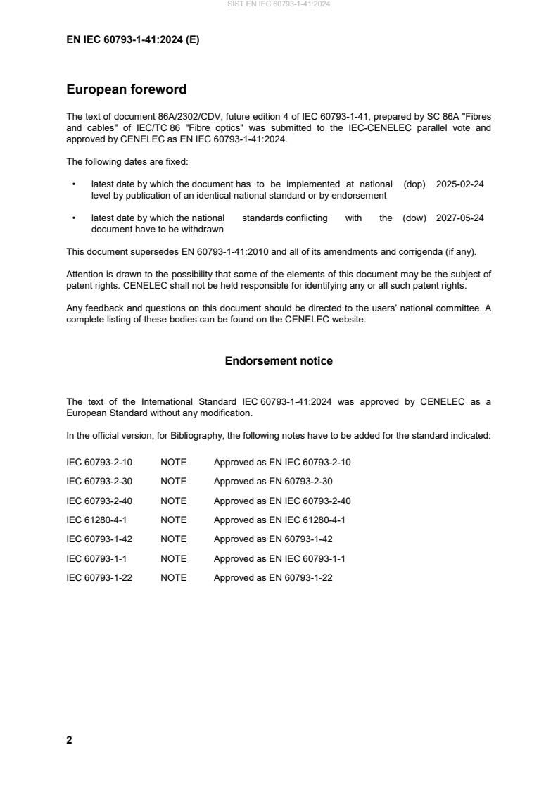 EN IEC 60793-1-41:2024 has the following relationships with other standards: It is inter standard links to EN 60793-1-41:2010, EN 60793-1-20:2014, EN 60793-1-43:2015, EN 3745-202:2005, EN 3745-303:2007, EN 60793-1-1:2017, EN IEC 61158-2:2023, EN 50551-1:2019, EN IEC 60793-2-40:2021, EN 60793-2-20:2016, EN 60793-2-10:2017, EN 60793-2-50:2016, EN 60793-2-40:2016, EN IEC 60793-2:2019, EN IEC 60793-2-50:2019. Understanding these relationships helps ensure you are using the most current and applicable version of the standard.