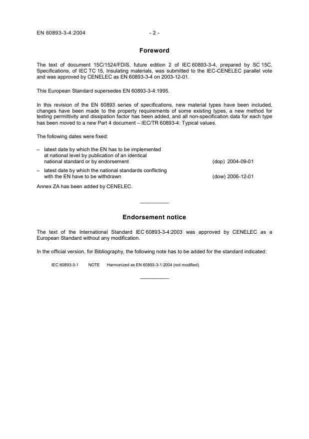 (dow) 2006-12-01 Annex ZA has been added by CENELEC. __________ Endorsement notice The text of the International Standard IEC 60893-3-4:2003 was approved by CENELEC as a European Standard without any modification. In the official version, for Bibliography, the following note has to be added for the standard indicated: