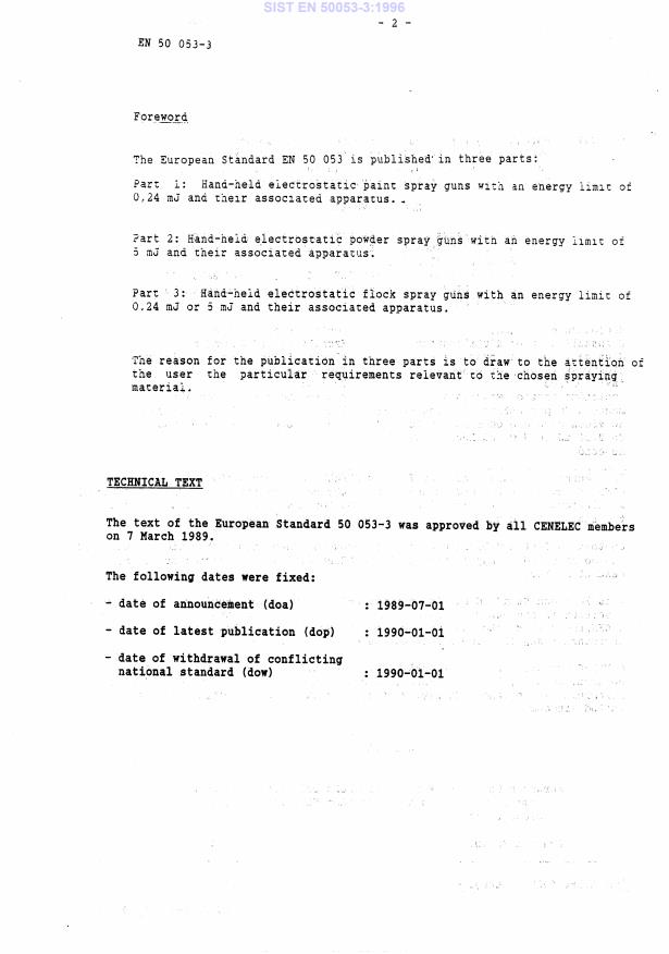 EN 50053-3:1989 is a standard published by CLC. Its full title is "Requirements for the selection, installation and use of electrostatic spraying equipment for flammable materials - Part 3: Hand-held electrostatic flock spray guns with an energy limit of 0,24 mJ or 5 mJ and their associated apparatus". This standard covers: This European Standard gives requirements for the selection, installation and safe use of hand-held electrostatic flock spray-guns and their associated apparatus complying with EN 50 050 for the following cases when: flock spraying in association with adhesives which can form an explosive atmosphere, then the energy limit of the spray gun shall be 0.24 mJ; flock spraying in association with adhesives which do not form an explosive atmosphere, then the energy limit of the spray gun shall be 0.5 mJ. This European Standard considers only the hazards that are specific to the electrostatic characteristics of the electrostatic spraying process. For other aspects such as classification of hazardous areas (e.g. classification into zones), selection, installation and use of electrical equipment in hazardous areas, health hazards (e.g. toxic and skin effects, electric shock), cleaning of flock spraying areas, fire hazard from external sources, storage and handling of flammable materials, explosion protection systems, national regulations apply. Note: applications of flock spray guns used only in association with adhesives do not form an explosive atmosphere and where the ignition energy of flock is greater than 500 mJ are being considered by CENELEC/TC 104.