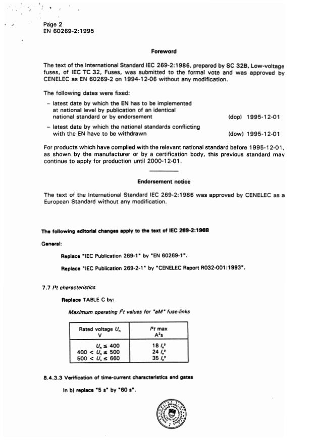 EN 60269-2:1995 is a standard published by CLC. Its full title is "Low-voltage fuses - Part 2: Supplementary requirements for fuses for use by authorized persons (fuses mainly for industrial application)". This standard covers: The following characteristics of fuses are specified in addition to IEC Publication 269-1: - minimum rated breaking capacities; - time-current characteristics; - I2t characteristics; - standard conditions of constructions; - power dissipation and acceptance.