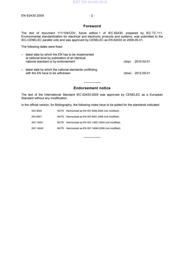 – 12 – 62430 © IEC:2009 c) guidance to improve environmental performance; d) end-of-life treatment; e) self-declaration indicating conformance with regulatory and customer requirements. SIST EN 62430:2010