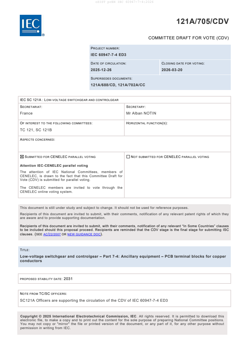 prEN IEC 60947-7-4:2025 is a draft published by CLC. Its full title is "Low-voltage switchgear and controlgear - Part 7-4: Ancillary equipment - PCB terminal blocks for copper conductors". This standard covers: Low-voltage switchgear and controlgear - Part 7-4: Ancillary equipment - PCB terminal blocks for copper conductors