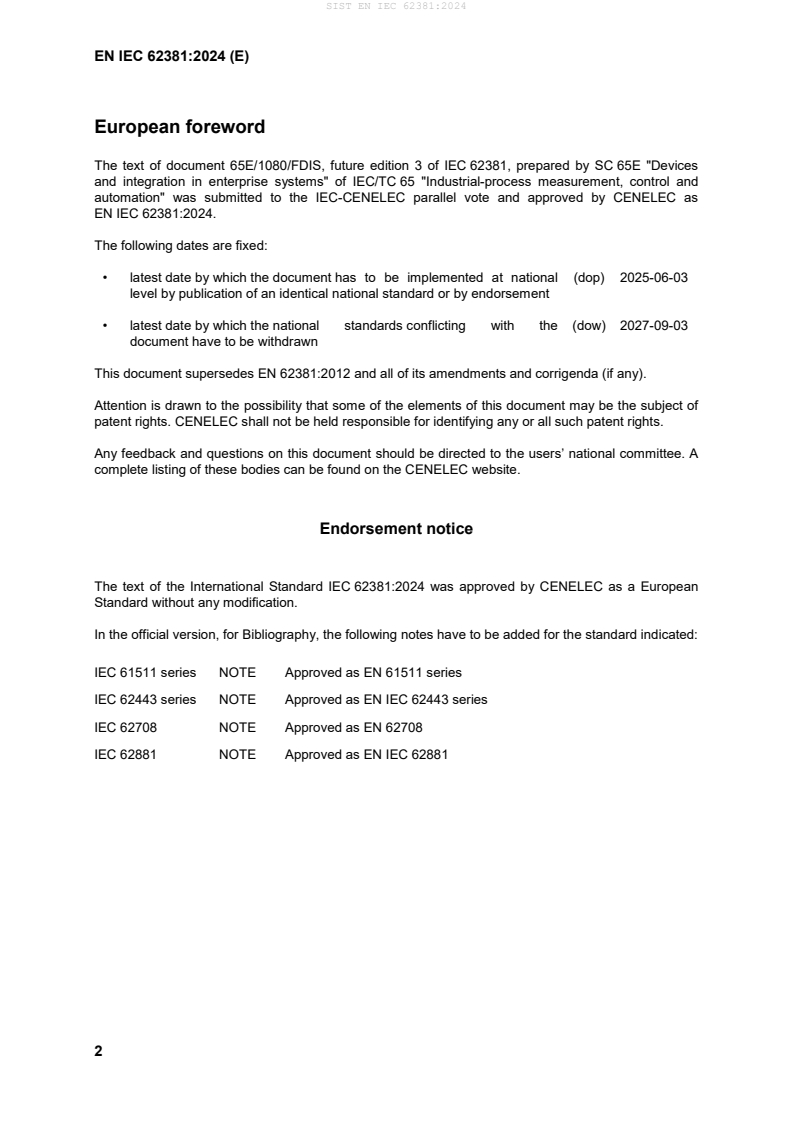 EN IEC 62381:2024 references and aligns with other IEC/CENELEC standards for process automation testing and safety (see normative references such as IEC 62382 and series like IEC 61511 and IEC 62443 noted in the foreword). Use EN IEC 62381 alongside applicable safety, cybersecurity and industry-specific standards when those domains are in scope.