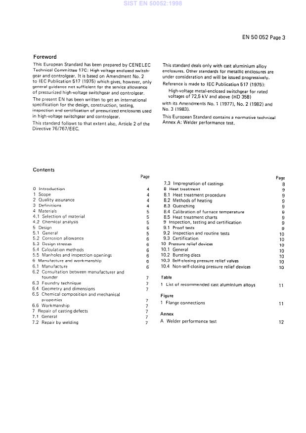 EN 50052:1986 is a standard published by CLC. Its full title is "Cast aluminium alloy enclosures for gas-filled high-voltage switchgear and controlgear". This standard covers: This standard applies to cast aluminium alloy enclosures pressurized with dry air, insert gases, for example sulphur hexafluoride or nitrogen or a mixture of such gases, used in indoor or outdoor installations of high-voltage switchgear and controlgear with rated voltages above 1 kV, where the gas is used principally for its dielectric and/or arc-quanching properties. The enclosures comprise parts of electrical equipment not necessarily limited to the following examples: circuit breakers, switch-disconnectors, disconnectors, earthing switches, current transformers, voltage transformers, surge arrestors, busbars and connections. The scope also covers pressurized components such as the centre chamber of live tank switchgear, gas-insulated current transformers, etc.