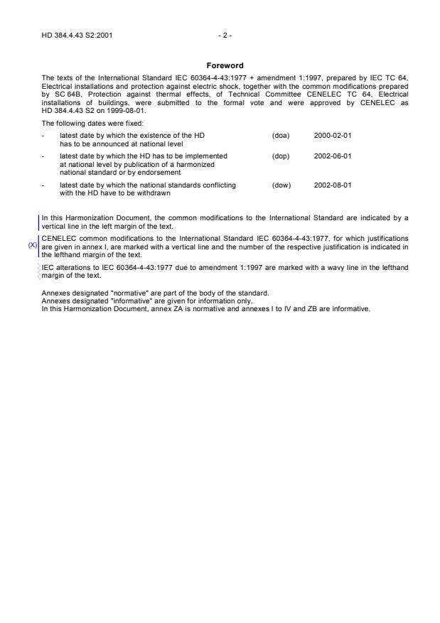 HD 384.4.43 S2:2001 is a standardization document published by CLC. Its full title is "Electrical installations of buildings - Part 4: Protection for safety - Chapter 43: Protection against overcurrent". This standard covers: Sets out general rules for protection of live conductors against overload and short circuit. Specifies the features of various protective devices and necessary coordination between conductors and overload protective devices. Formula for calculation of time in which a given short-circuit current will raise a conductor from the highest admissible temperature in normal duty to its limit temperature. Enumerates requirements for coordination of overload and short-circuit protection. Note: For details of -low-voltage circuit breakers, see EN 60974-2 -low-voltage fuses, see EN 60269 -for coordination of low-voltage direct-online (full voltage) motor starters with short-circuit protective devices, see EN 60974-1 -for current-carrying capacities of conductors for electrical installations of buildings, see IEC 60364-5-523.