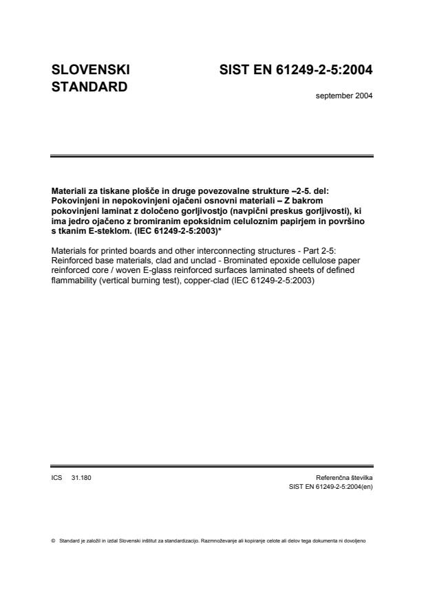 Materiali za tiskane plošče in druge povezovalne strukture –2-5. del: Pokovinjeni in nepokovinjeni ojačeni osnovni materiali – Z bakrom pokovinjeni laminat z določeno gorljivostjo (navpični preskus gorljivosti), ki ima jedro ojačeno z bromiranim epoksidnim celuloznim papirjem in površino s tkanim E-steklom. (IEC 61249-2-5:2003)*