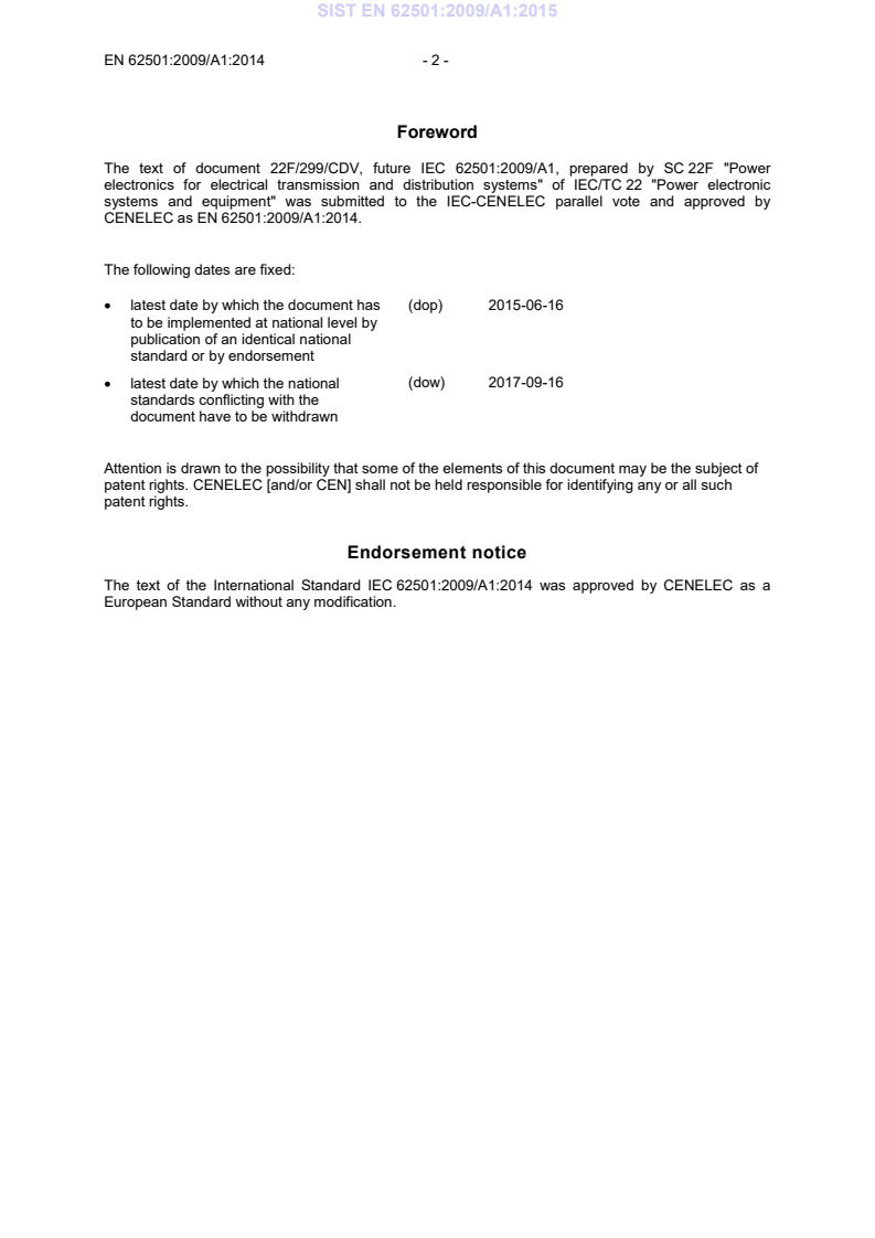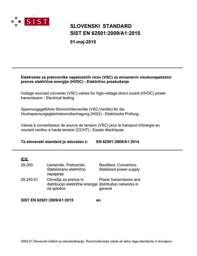 EN 62501:2009/A1:2014 is the CENELEC amendment to the IEC standard for Voltage Sourced Converter (VSC) valves used in HVDC power transmission - focused on electrical testing. This amendment updates the original EN/IEC 62501:2009 to include additional definitions, test scope (notably dynamic braking valves), topologies and testing guidance for modern VSC technologies such as MMC and cascaded two‑level (CTL) converters. The standard addresses electrical type and production tests, test conditions and acceptance criteria for VSC valves used in HVDC (and can be used as guidance for STATCOM valves).