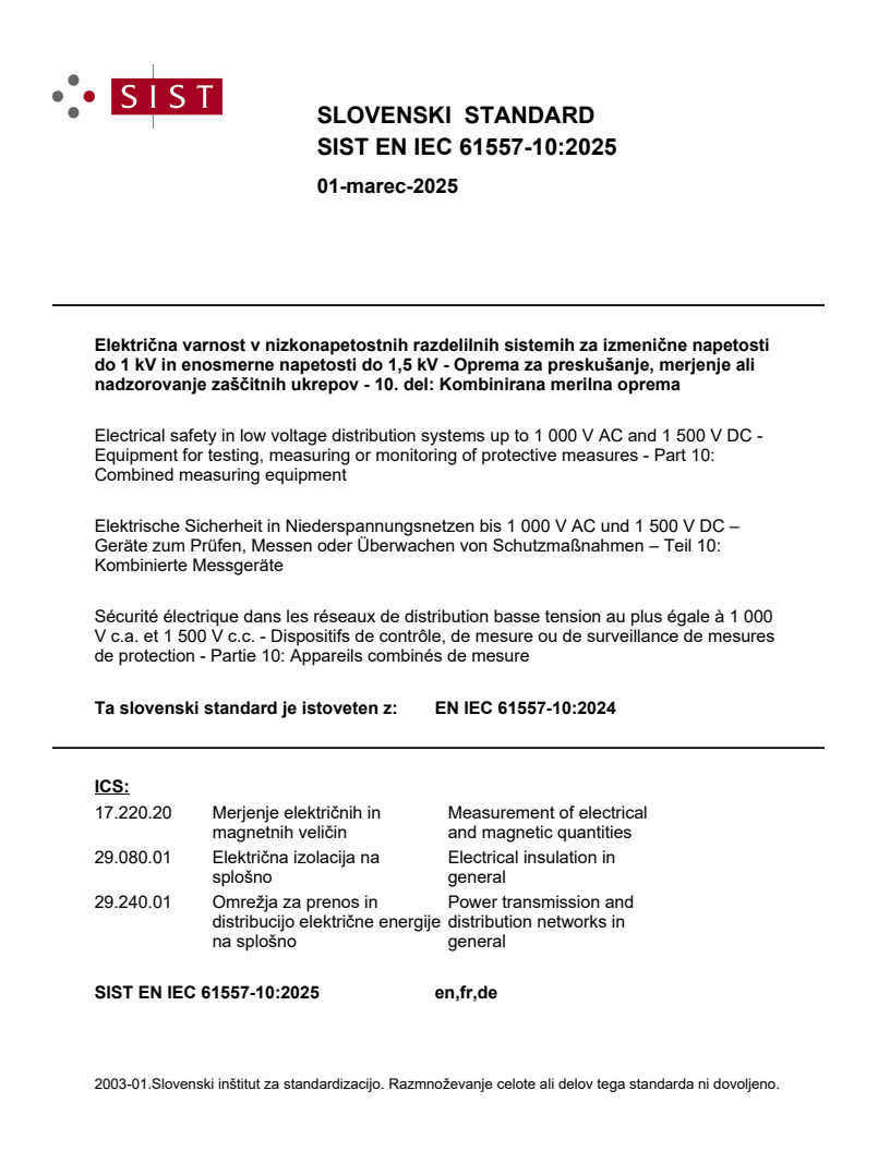 Električna varnost v nizkonapetostnih razdelilnih sistemih za izmenične napetosti do 1 kV in enosmerne napetosti do 1,5 kV - Oprema za preskušanje, merjenje ali nadzorovanje zaščitnih ukrepov - 10. del: Kombinirana merilna oprema