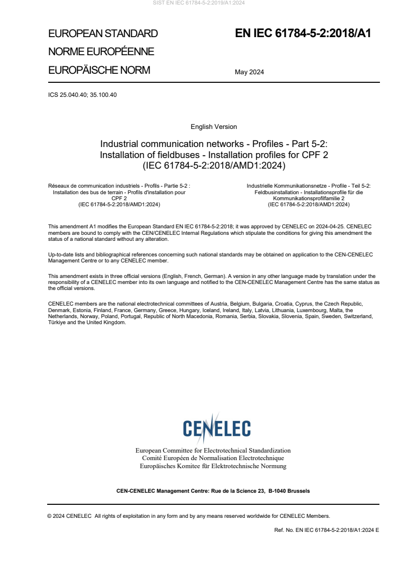 This amendment A1 modifies the European Standard EN IEC 61784-5-2:2018; it was approved by CENELEC on 2024-04-25. CENELEC