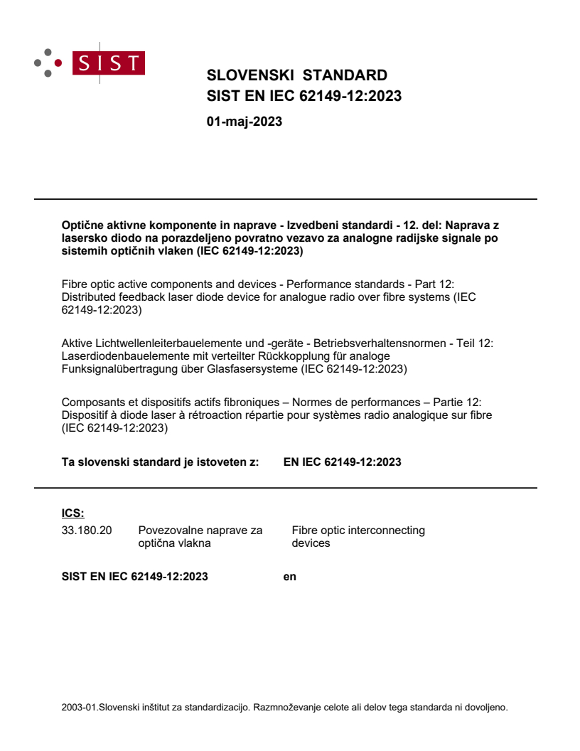 Standard IEC 62149-12:2023 Ta del standarda IEC 62149 določa specifikacije delovanja naprav z distribucijsko povratno lasersko diodo (DFB-LD), ki se uporabljajo v analognih sistemih za prenos radijskih signalov po optičnih kablih (RoF). Določa zahteve glede zmogljivosti za izdelek skupaj z naborom preskusov in meritev z jasno določenimi pogoji, stopnjami zahtevnosti in merili za uspešno/neuspešno opravljen preskus. Preskusi so namenjeni enkratnemu izvajanju, z njimi pa se dokaže, ali lahko izdelek izpolnjuje zahteve glede zmogljivosti.