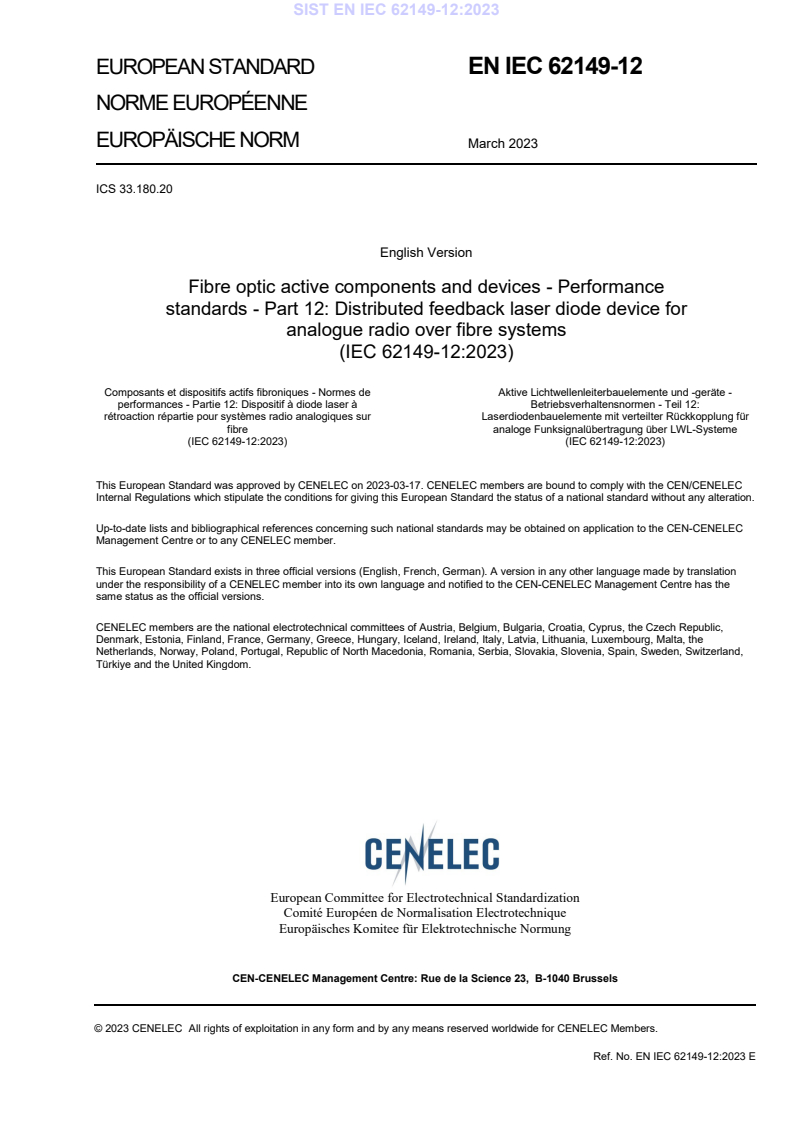 Keywords: EN IEC 62149-12:2023, IEC 62149-12, DFB-LD, distributed feedback laser diode, radio over fibre, analogue RoF, fibre optic active components, performance standards, DFB laser testing.