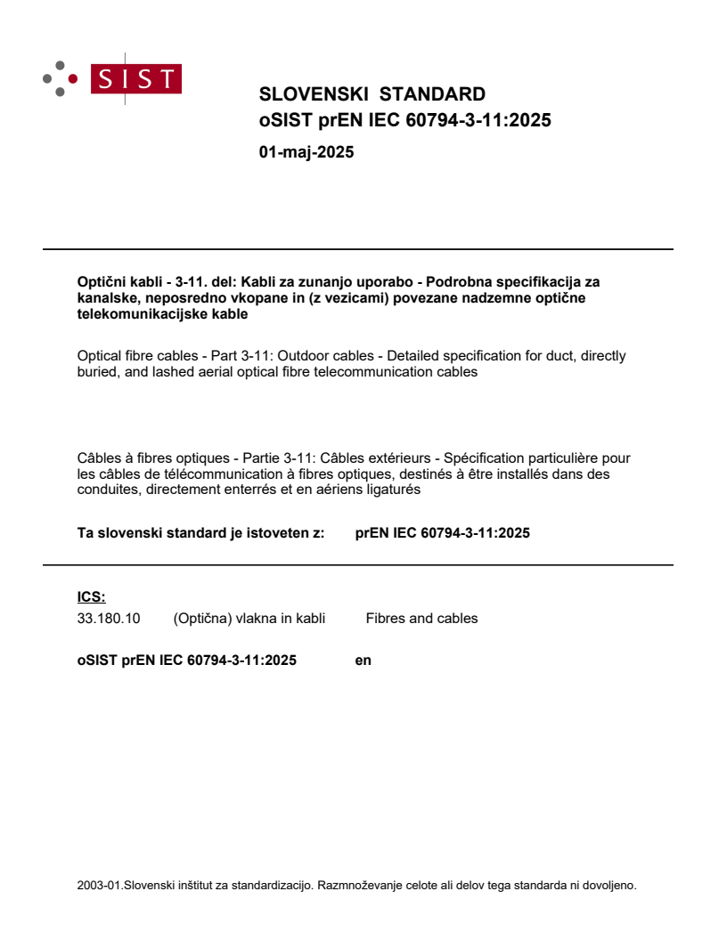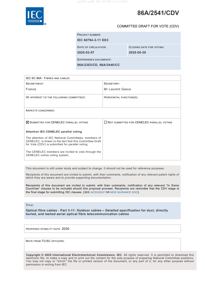 By adhering to prEN IEC 60794-3-11:2025, industry stakeholders can ensure that outdoor optical fibre cables achieve optimum performance, environmental resistance, and installation versatility - underpinning modern telecommunication networks with reliable, standardized infrastructure.