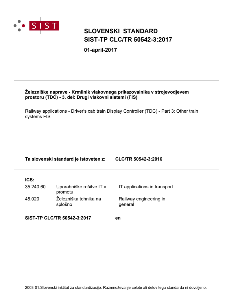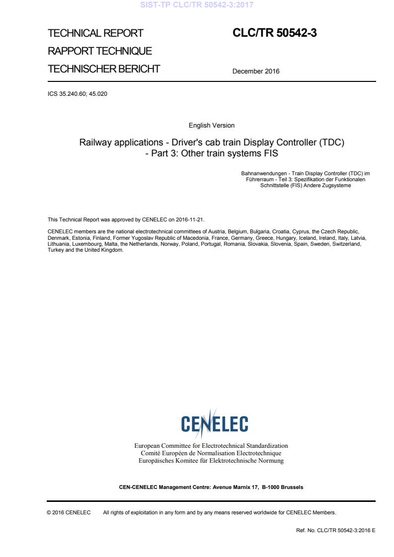CLC/TR 50542-3:2016 is a technical report published by CLC. Its full title is "Railway applications - Driver's cab train Display Controller (TDC) - Part 3: Other train systems FIS". This standard covers: The scope of this document is the definition of the functional interface between TDC and other train systems. These other train systems are the train systems (different from ETCS (Subset 121) and DMIs) from the TDC point of view. The functional interface deals with data exchanged between TDC and these train systems. The TDC is defined in document CLC/TR 50542-1.