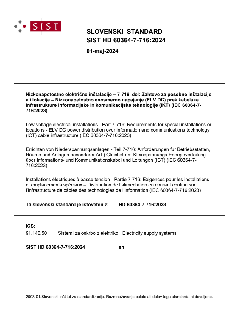 Nizkonapetostne električne inštalacije – 7-716. del: Zahteve za posebne inštalacije ali lokacije – Nizkonapetostno enosmerno napajanje (ELV DC) prek kabelske infrastrukture informacijske in komunikacijske tehnologije (IKT) (IEC 60364-7-716:2023)