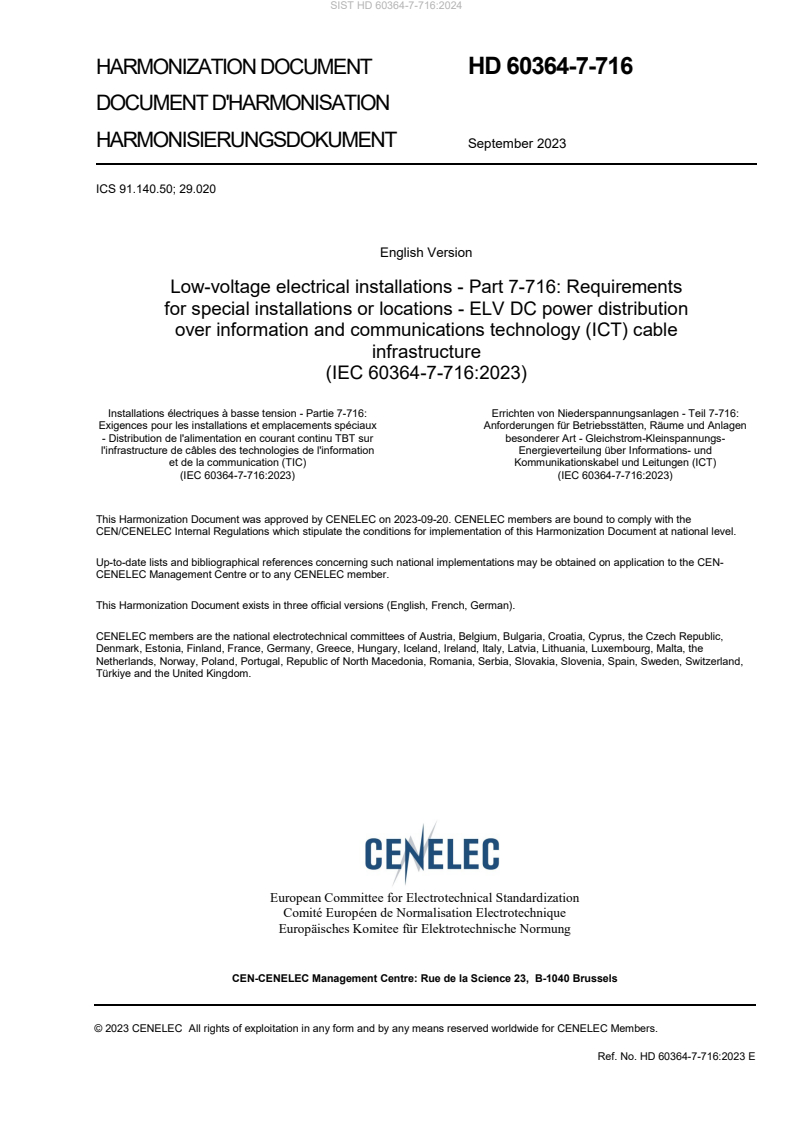 HD 60364-7-716:2023 is a standardization document published by CLC. Its full title is "Low-voltage electrical installations - Part 7-716: Requirements for special installations or locations – ELV DC power distribution over information and communications technology (ICT) cable infrastructure". This standard covers: IEC 60364-7-716:2023 specifies requirements in electrical installations for the distribution of ELV DC power using balanced, information technology cables and accessories primarily designed for data transmission, as specified in terms of a category within the channels of ISO/IEC 11801-1 using power sourcing equipment in accordance with IEC 62368-3. Requirements are included for the design, erection, and verification of telecommunications infrastructure for the purpose of both telecommunications and distribution of ELV DC power. In addition, requirements are included for use of existing telecommunications infrastructure for distribution of ELV DC power. The power delivery systems include, but are not restricted to, the Power over Ethernet systems specified by IEEE 802.3. This document does not apply to the use of cables and accessories within the core and access networks for example private branch exchange (PBX).