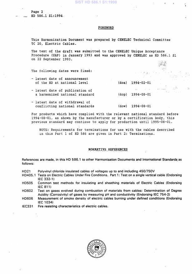 HD 586.1 S1:1994 is a standardization document published by CLC. Its full title is "Mineral insulated cables with a rated voltage not exceeding 750 V - Part 1: Cables". This standard covers: This standard applies to mineral insulated general wiring cables with copper sheath and copper conductors with rated voltages up to 750 V. Provision is made for a corrosion resistant outer covering over the sheath, when required. This outer covering is not specified for the purposes of electrical insulation of the metal sheath.