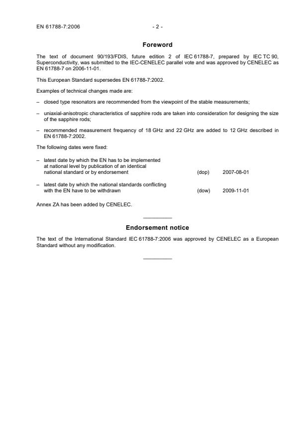 Superprevodnost - 7. del: Meritve elektronskih lastnosti - Površinska upornost superprevodnikov pri mikrovalovnih frekvencah (IEC 61788-7:2006)
