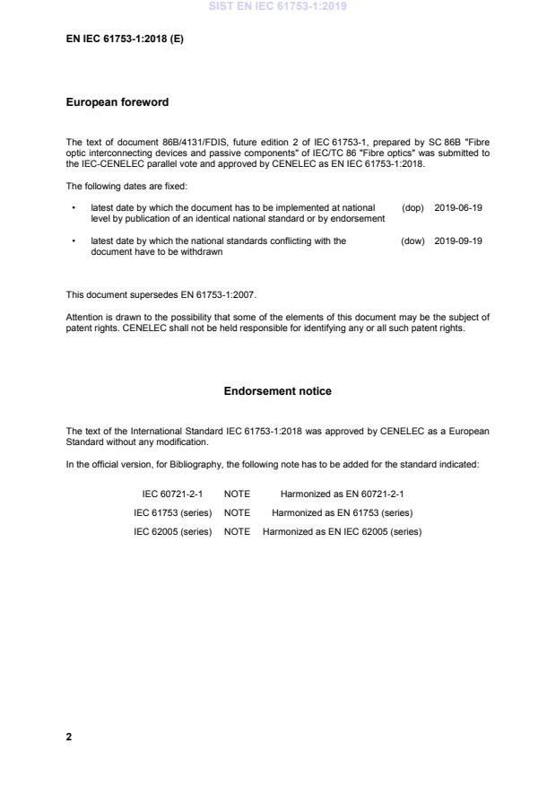 EN IEC 61753-1:2018 is a standard published by CLC. Its full title is "Fibre optic interconnecting devices and passive components - Performance standard - Part 1: General and guidance". This standard covers: NEW!IEC 61753-1:2018 is available as IEC 61753-1:2018 RLV which contains the International Standard and its Redline version, showing all changes of the technical content compared to the previous edition.IEC 61753-1:2018 provides guidance for the drafting of performance standards for all passive fibre optic products. This document defines the tests and severities which form the performance categories or general operating service environments and identifies those tests which are considered to be product specific. Test and severity details are given in Annex A. This second edition cancels and replaces the first edition published in 2007. It constitutes a technical revision. This edition includes the following significant technical changes with respect to the previous edition: a) definitions updated with new products: wall outlets, wall or pole mounted boxes, splices, ODF modules, street cabinets, hardened connectors and field mountable connectors; b) categories U and O are replaced by categories OP and OP+. No mandatory sequence in category OP+. Category OP+ contains the tests from category OP with the addition of only 4 other tests; c) addition of Category I (Industrial); d) temperature ranges added (with the HD suffix to the categories C, OP, OP+ and I) in case passive optical components are placed in a housing together with active electronics (HD stands for “heat dissipation”); e) the height of category A changed from 3 m to ground level (0 m); f) the lower level height of category G environment changed from ground level (0 m) to –1 m below ground level. Upper level remains at 3 m above ground level; g) addition of performance tests, test severities and performance criteria for new products: Wall outlet, wall or pole mounted boxes, mechanical splices, fusion splice protectors, ODF modules, street cabinets, field mountable connectors and hardened optical connectors; h) test severity of "Mating durability" test for connectors in categories C, OP ,OP+ and I is reduced to 200 cycles for connectors with cylindrical ferrules and 50 cycles for connectors with rectangular ferrules; i) test severity of "Change of temperature" test for connectors and passive optical components in category I is reduced from 20 cycles to 12 cycles (harmonized with connectors and components from other categories); j) test severity of "Flexing of strain relief" test for connectors in categories C, OP and OP+ is reduced to 50 cycles; k) test severities of "Assembly and disassembly of fibre optic mechanical splices, fibre management systems and closures" test for all enclosures is reduced to 5 cycles; l) test severities of "Change of temperature" test for all protective housings in categories C, A, G and S is reduced from 20 cycles to 12 cycles (harmonized with connectors and components); m) test severities of "Resistance to solvents and contaminating fluids" test for closures in categories G and S changed – kerosene is removed, diesel oil exposure reduced to 1 h immersion and 24 h drying at room temperature; n) sealing performance criteria of sealed closures for categories G and A are reduced to 20 kPa overpressure. o) the change in attenuation criterion for connectors has changed from peak-to-peak into a +/- deviation from the original value of the transmitted power at the start of the test (harmonized with the change in attenuation criterion