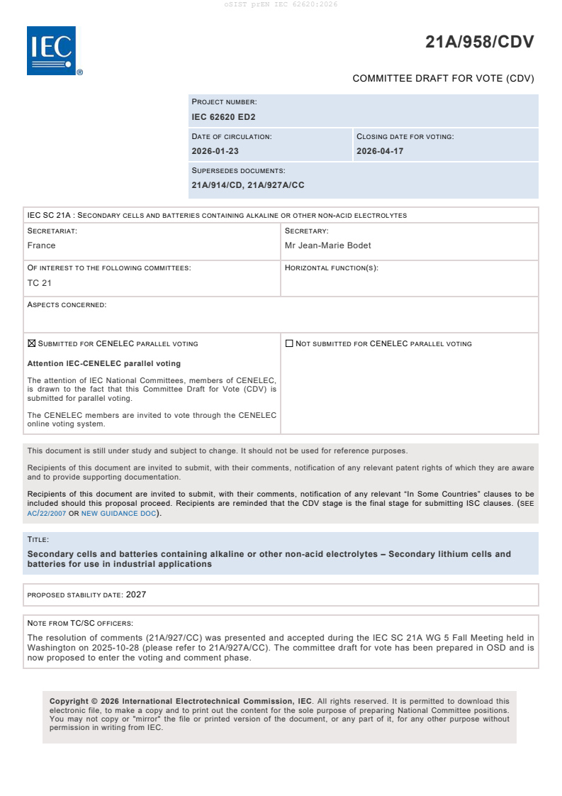 prEN IEC 62620:2026 is a draft published by CLC. Its full title is "Secondary cells and batteries containing alkaline or other non-acid electrolytes - Secondary lithium cells and batteries for use in industrial applications". This standard covers: Secondary cells and batteries containing alkaline or other non-acid electrolytes - Secondary lithium cells and batteries for use in industrial applications