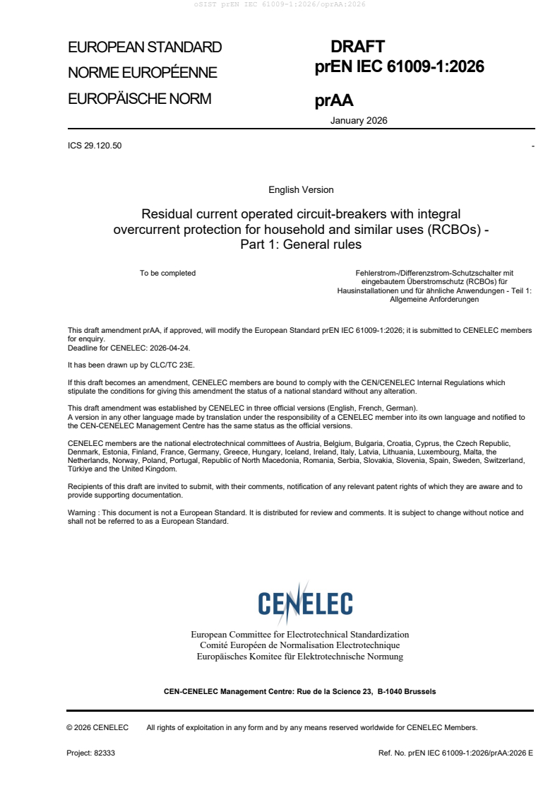 This draft amendment prAA, if approved, will modify the European Standard prEN IEC 61009-1:2026; it is submitted to CENELEC members