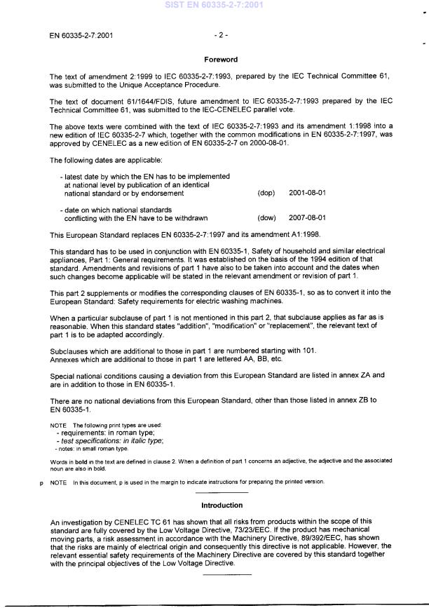 EN 60335-2-7:2001 is associated with the following European legislation: EU Directives/Regulations: 2006/95/EC, 73/23/EEC. When a standard is cited in the Official Journal of the European Union, products manufactured in conformity with it benefit from a presumption of conformity with the essential requirements of the corresponding EU directive or regulation.