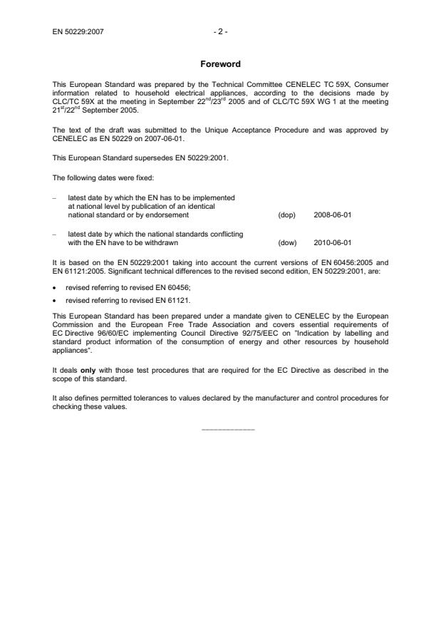 2010-06-01 It is based on the EN 50229:2001 taking into account the current versions of EN 60456:2005 and EN 61121:2005. Significant technical differences to the revised second edition, EN 50229:2001, are: • revised referring to revised EN 60456; • revised referring to revised EN 61121. This European Standard has been prepared under a mandate given to CENELEC by the European Commission and the European Free Trade Association and covers essential requirements of EC Directive 96/60/EC implementing Council Directive 92/75/EEC on ”Indication by labelling and standard product information of the consumption of energy and other resources by household appliances“. It deals only with those test procedures that are required for the EC Directive as described in the scope of this standard. It also defines permitted tolerances to values declared by the manufacturer and control procedures for checking these values. _____________