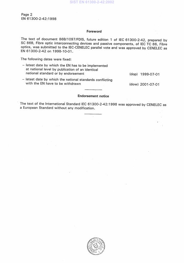 EN 61300-2-42:1998 has the following relationships with other standards: It is inter standard links to EN 61300-2-42:2005, EN 61753-053-3:2004, EN 61753-022-2:2003, EN 61753-021-2:2002, EN 62149-1:2004, EN 61753-121-3:2010, EN 61300-1:2011, EN 61291-5-2:2002, EN 61753-2-1:2000. Understanding these relationships helps ensure you are using the most current and applicable version of the standard.