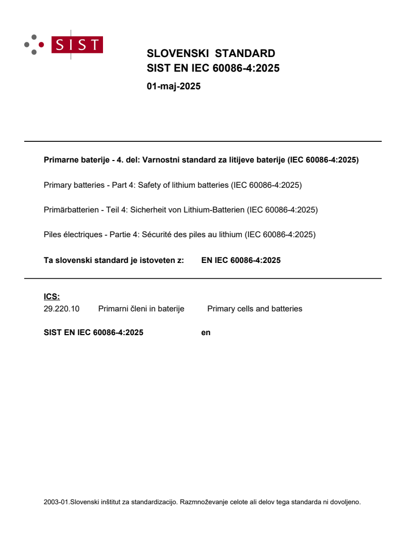Primarne baterije - 4. del: Varnostni standard za litijeve baterije (IEC 60086-4:2025)