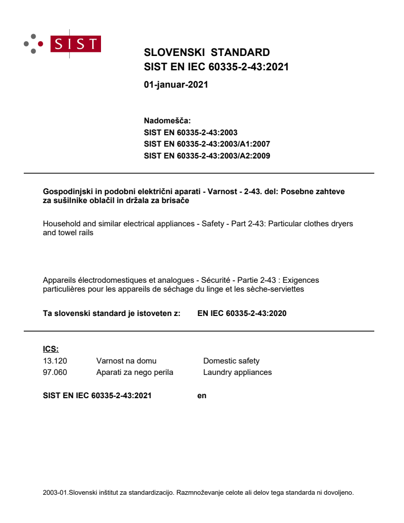 EN IEC 60335-2-43:2020 is the CLC-adopted European version of IEC 60335-2-43 (edition 4.0). It specifies safety requirements for electric clothes dryers and towel rails for household and similar use (rated voltage ≤ 250 V). The standard covers dryers that dry textiles on racks (fixed or free‑standing) using natural or forced airflow, plus appliances intended for drying footwear or gloves. It replaces the 2003 edition and its amendments and is intended to be used together with IEC 60335-1 (general safety requirements).