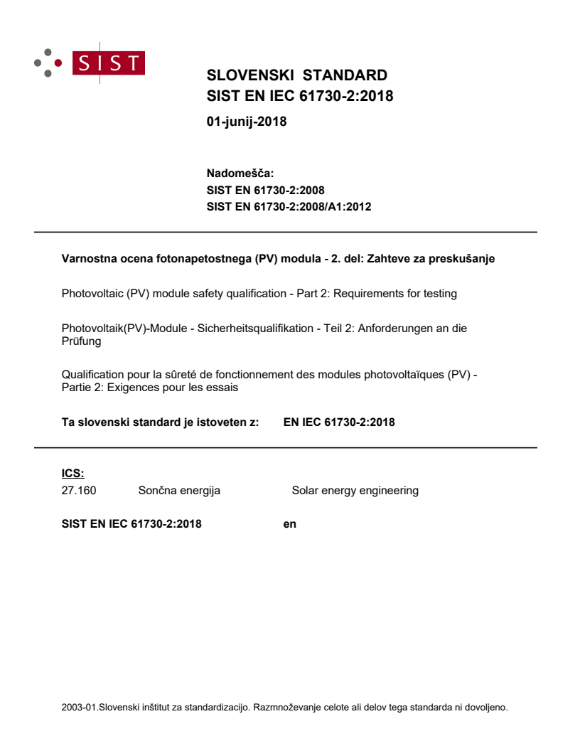 Ta slovenski standard je istoveten z: EN IEC 61730-2:2018