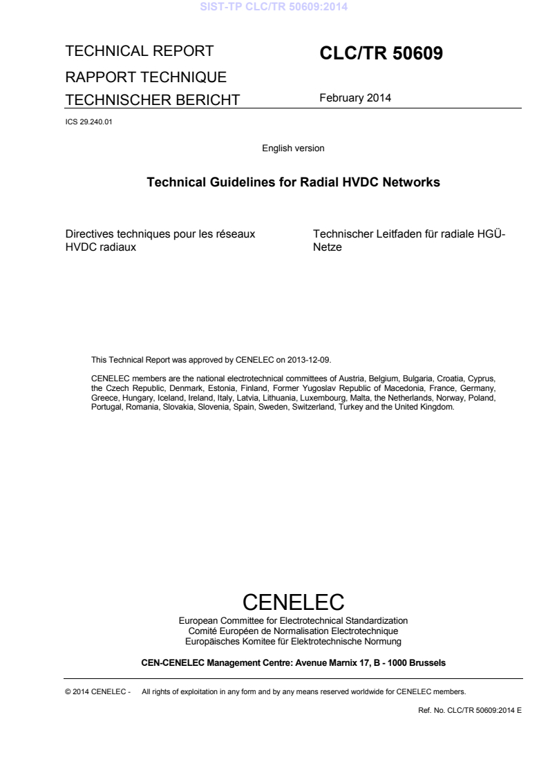 CLC/TR 50609:2014 is a technical report published by CLC. Its full title is "Technical Guidelines for Radial HVDC Networks". This standard covers: This Technical Report applies to HVDC Systems having more than two converter stations connected to a common DC network, also referred to as HVDC Grid Systems. Serving the near term applications, this report describes radial HVDC network structures as well as pure VSC based solutions. Both grounded and ungrounded DC circuits are considered. Based on typical requirements applied to state of the art HVDC converter stations today this report addresses aspects that are specifically related to the design and operation of converter stations and DC circuits in HVDC Grid Systems. The requirements from the AC systems as known today are included. Secondary effects associated with changing the AC systems, e.g. the replacement of rotating machines by power electronic devices, are not within the scope of the present report. The report summarises applications and concepts of HVDC Grid Systems with the purpose of preparing the ground for standardization of such systems. The interface requirements and functional specifications given in this document are intended to support the specification and purchase of multi vendor multiterminal HVDC Grid Systems.