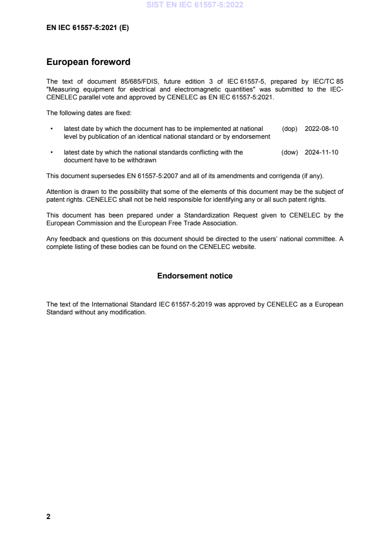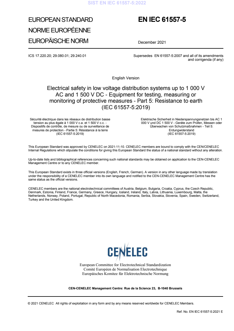 EN IEC 61557-5:2021 (equivalent to IEC 61557-5:2019) defines requirements for equipment that measures resistance to earth in low-voltage distribution systems (up to 1 000 V AC and 1 500 V DC) using an AC test voltage. It is part of the IEC 61557 series on electrical safety for testing, measuring and monitoring protective measures. This third edition is a technical revision that updates definitions, test structures and adds requirements for clamp-type instruments and marking.