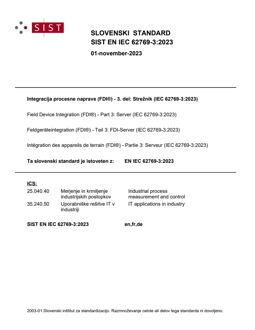 EN IEC 62769-3:2023 is a standard published by CLC. Its full title is "Field Device Integration (FDI®) - Part 3: Server". This standard covers: IEC 62769-3:2023 is available as IEC 62769-3:2023 RLV which contains the International Standard and its Redline version, showing all changes of the technical content compared to the previous edition.IEC 62769-3:2023 specifies the FDI®[1] Server. The overall FDI® architecture is illustrated in Figure 1. The architectural components that are within the scope of this document have been highlighted in this figure. Annex A provides a functional description of the FDI® Server. [1] FDI® is a registered trademark of the non-profit organization Fieldbus Foundation, Inc. This information is given for the convenience of users of this document and does not constitute an endorsement by IEC of the trademark holder or any of its products. Compliance does not require use of the trade name. Use of the trade name requires permission of the trade name holder.
