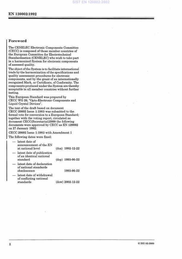 EN 120002:1992 is a standard published by CLC. Its full title is "Blank Detail Specification: Infrared emitting diodes, infrared emitting diode arrays". This standard covers: Supersedes CECC 20 002 Issue 1:1983 (and A1) * TC 86D disbanded at 105 BT