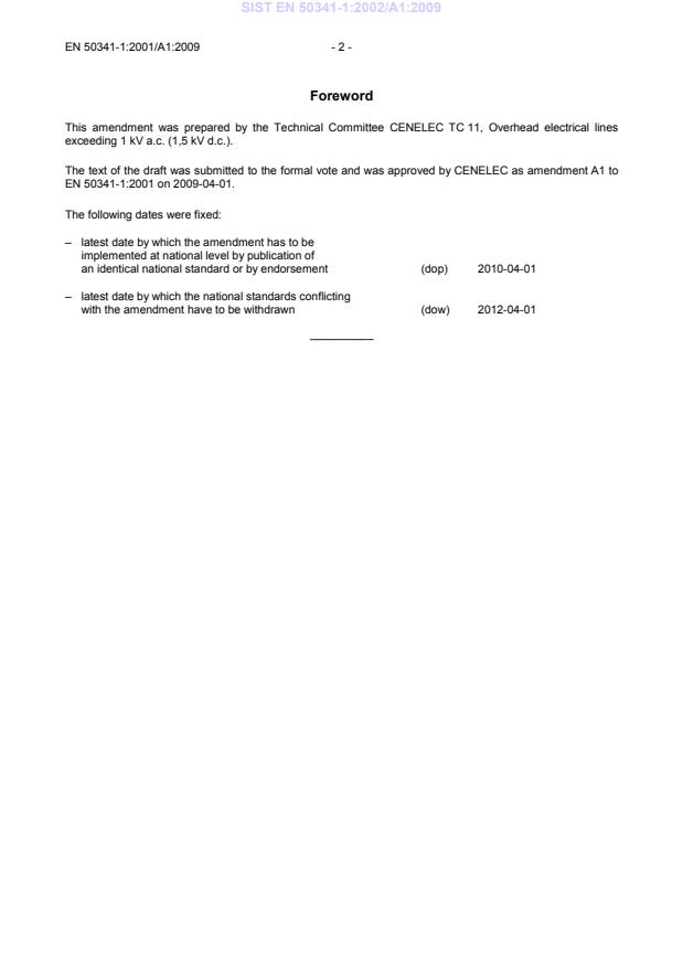 This amendment A1 modifies the European Standard EN 50341-1:2001; it was approved by CENELEC on